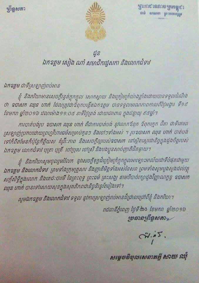 ខាងក្រោមនេះជាលិខិតរបស់សម្តេច សាយ ឈុំ ផ្ញើជូនឧកញ៉ា សៀង ណាំ និងភរិយា៖